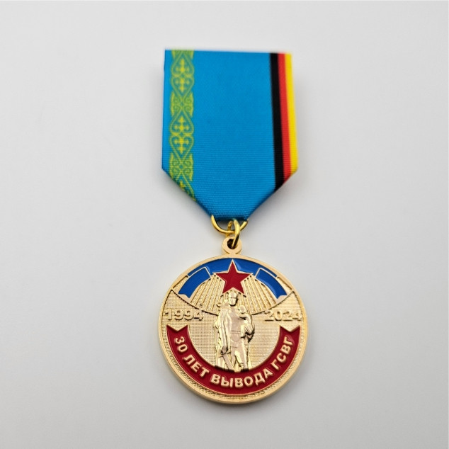 Медаль «30 лет вывода ГСВГ» посвящена важной исторической дате — выводу Группы советских войск в Германии (ГСВГ) с территории Германии в 1994 году. На медали изображён воин с ребёнком на руках на фоне стилизованных лучей парашюта, красной звезды и цифр 1994–2024. Внизу размещена надпись на бордовой ленте: «30 лет вывода ГСВГ», символизируя преемственность поколений, воинскую честь и окончание важной военной миссии.